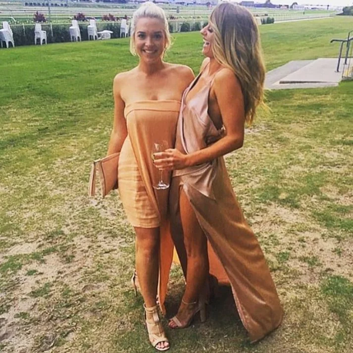 Our gorgeous clients @phoebecoooney & @eliza_gray looking 🔥🔥🔥 in our Sabo Luxe blush gown & Alice McCall New Romantics Jumpsuit 😍